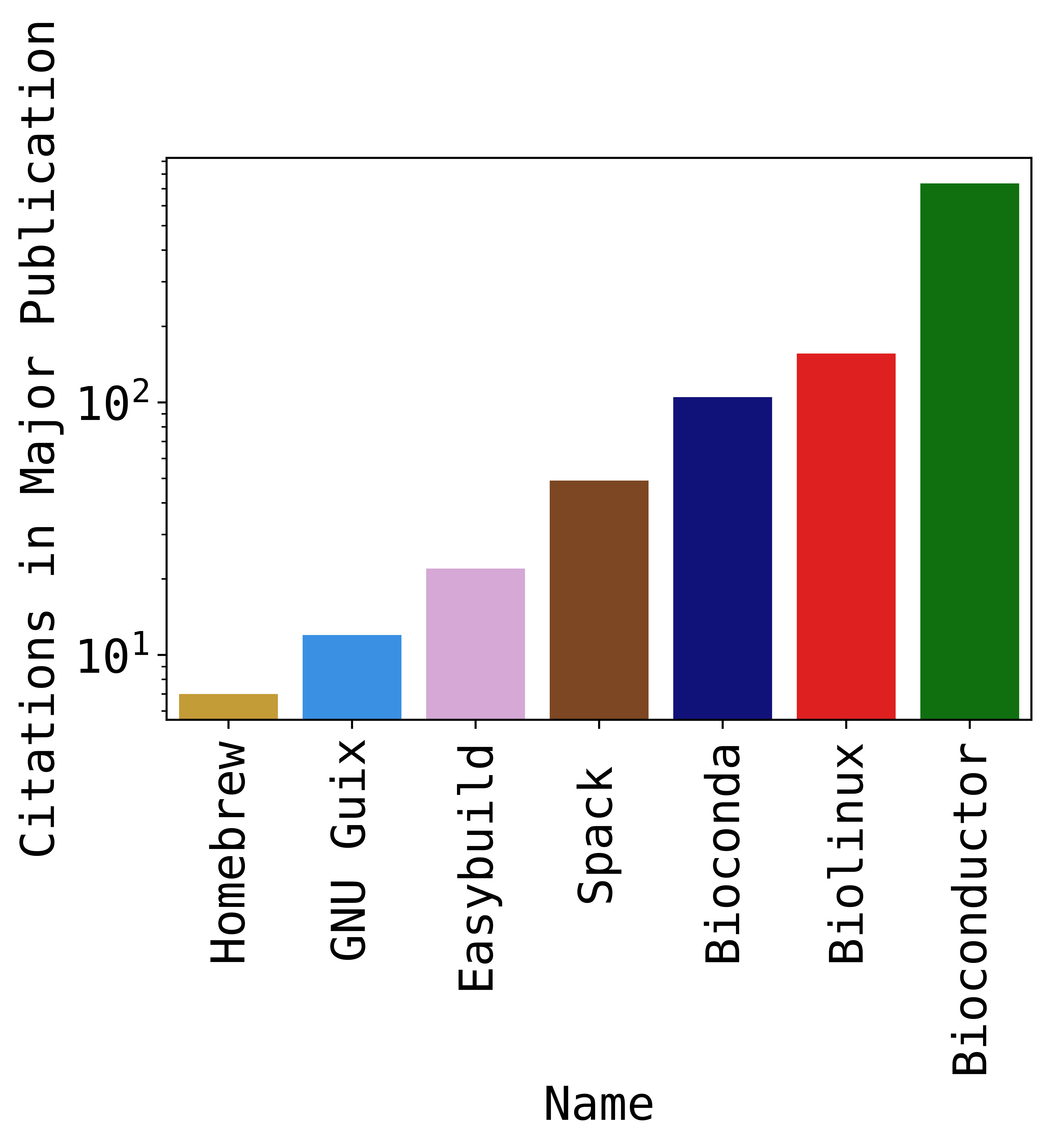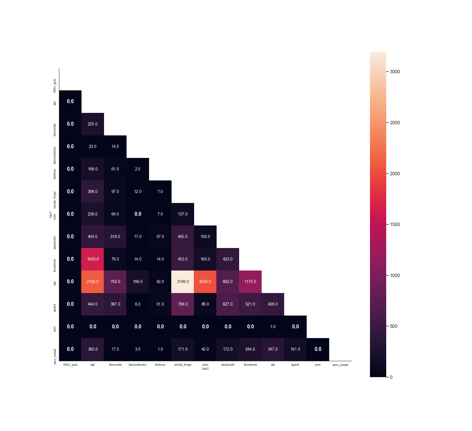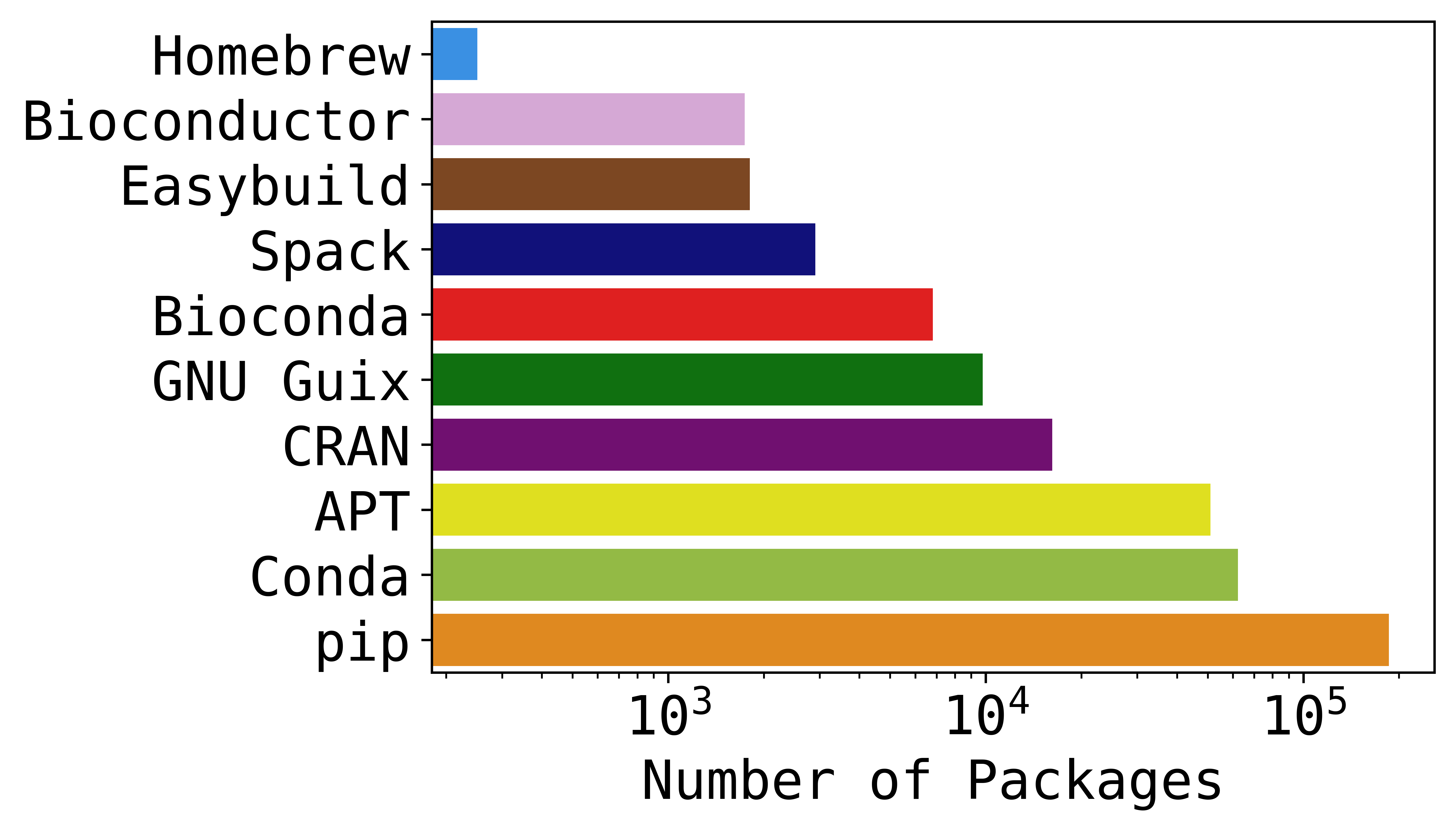 8 The initial list of all available sofware for each package manager was compiled by parsing its online repository with WebScraper 13/ (AppImage 14, Bioconda 15, Bioconductor 16, BioContainers [???], CRAN 17, Docker 18, EasyBuild 19, Flatpak 20, GNU Guix 21, omicX 22, pip 23, Singularity 24, Snap 25, Spack 26, Vagrant 27, and Zero Install 28) or by querying the package manager directly (APT, Biocontainers, Conda, Homebrew). Each list converted to a set with pandas 29/ and NumPy 30/, which removed all capitalization and duplicates. The number of entries in a package manager’s set was taken to be the total number of packages available for that package manager.