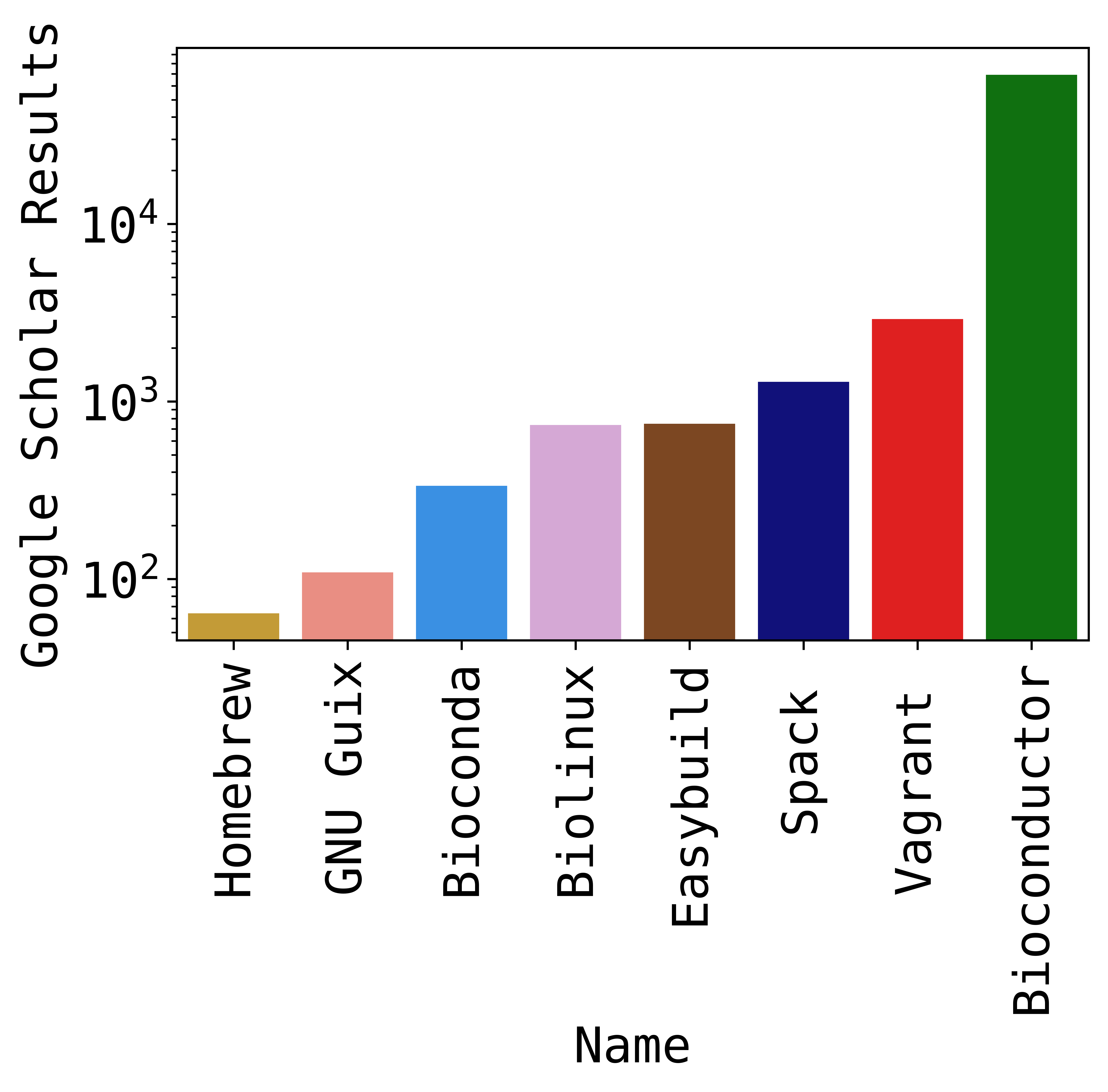 7 Each package manager’s name was used as a search term on Google Scholar 12/ and the number of results was recorded. Package manager names that returned results for things other than the package manager were omitted.