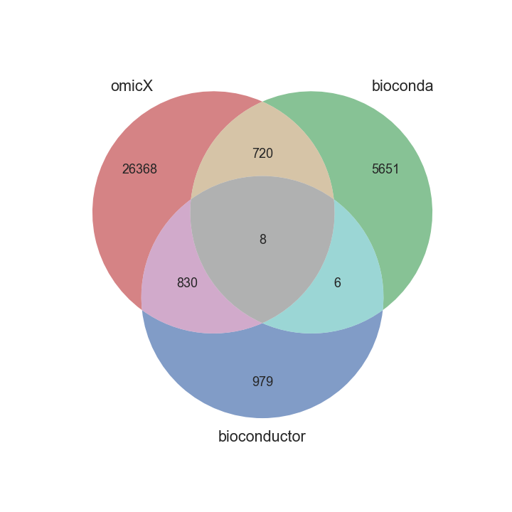 ?? The sets obtained for Bioconda, Bioconductor, and omicX in 8 were compared with the set intersection function to find the number of commonalities between all combinations of the three package managers.