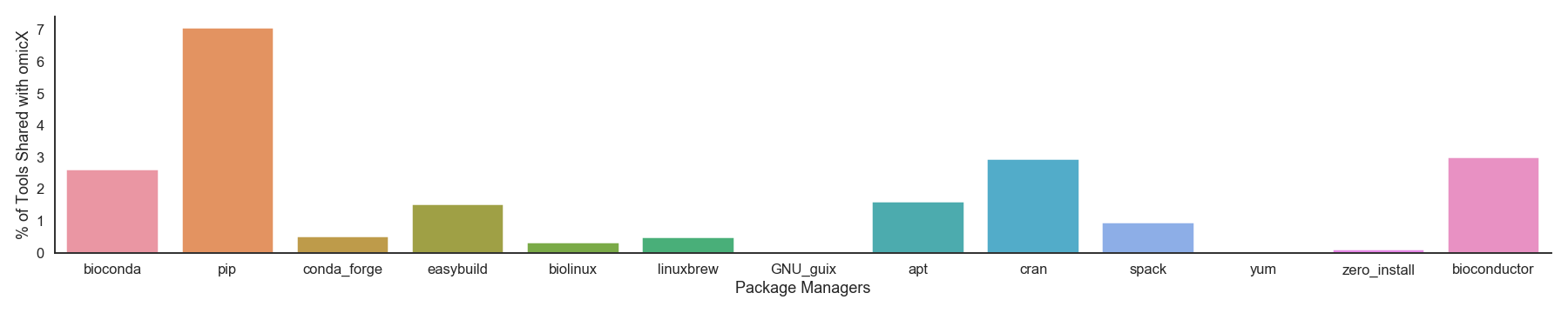 13 The sets obtained for omicX and the non-omics package managers in 8 were compared with the set intersection function to find the number of commonalities between omicX and the non-omics package managers.