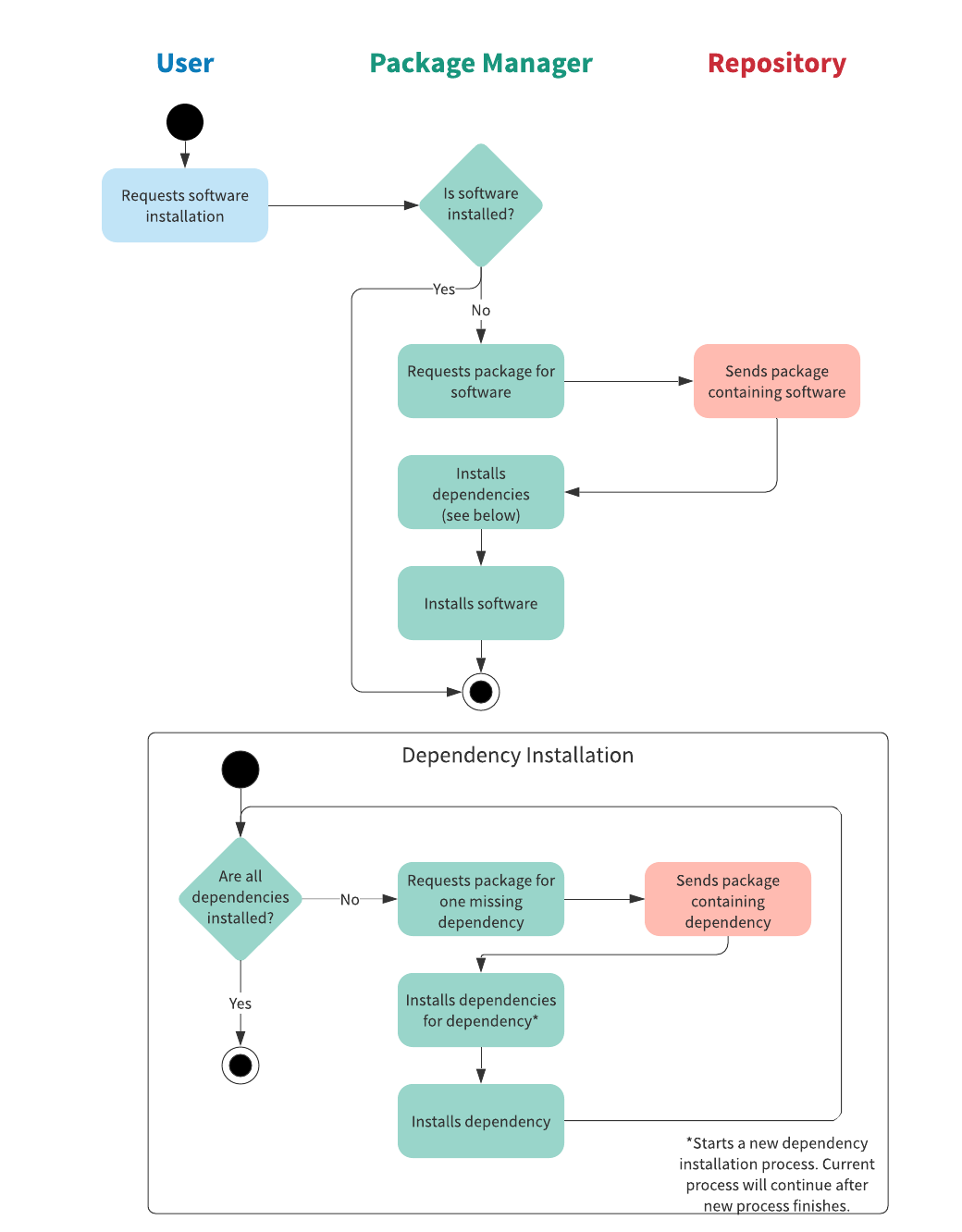 The package manager verifies each dependency by confirming that the dependency is already installed or installing the dependency if it is missing. For missing dependencies, the package manager retrieves the dependency’s package from the repository and starts the installation procedure for that package. Once all the dependencies are installed, the initially requested software is installed. However, the package manager often goes through several iterations of this process because every dependency can have it’s own list of dependencies, in which case each of the dependency’s dependencies must be verified through the same process.