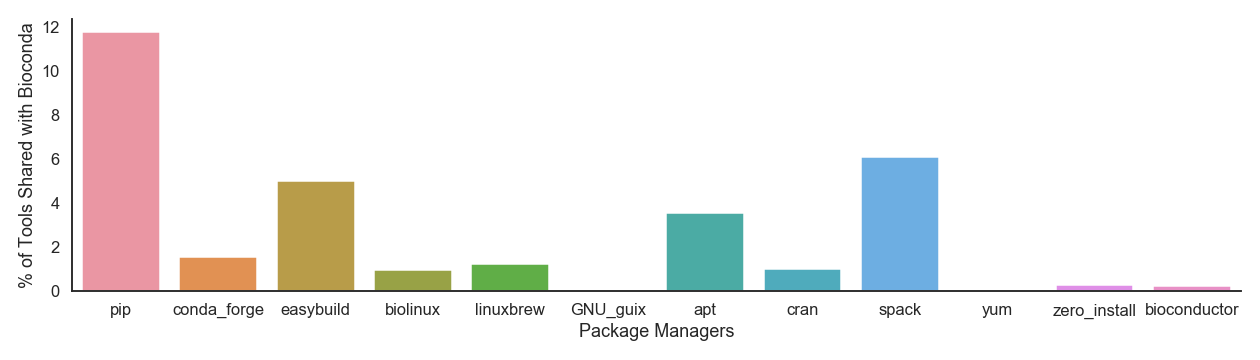 11 The sets obtained for Bioinformatics Tools and the non-omics package managers in 8 were compared with the set intersection function to find the number of commonalities between Bioconda and the non-omics package managers.