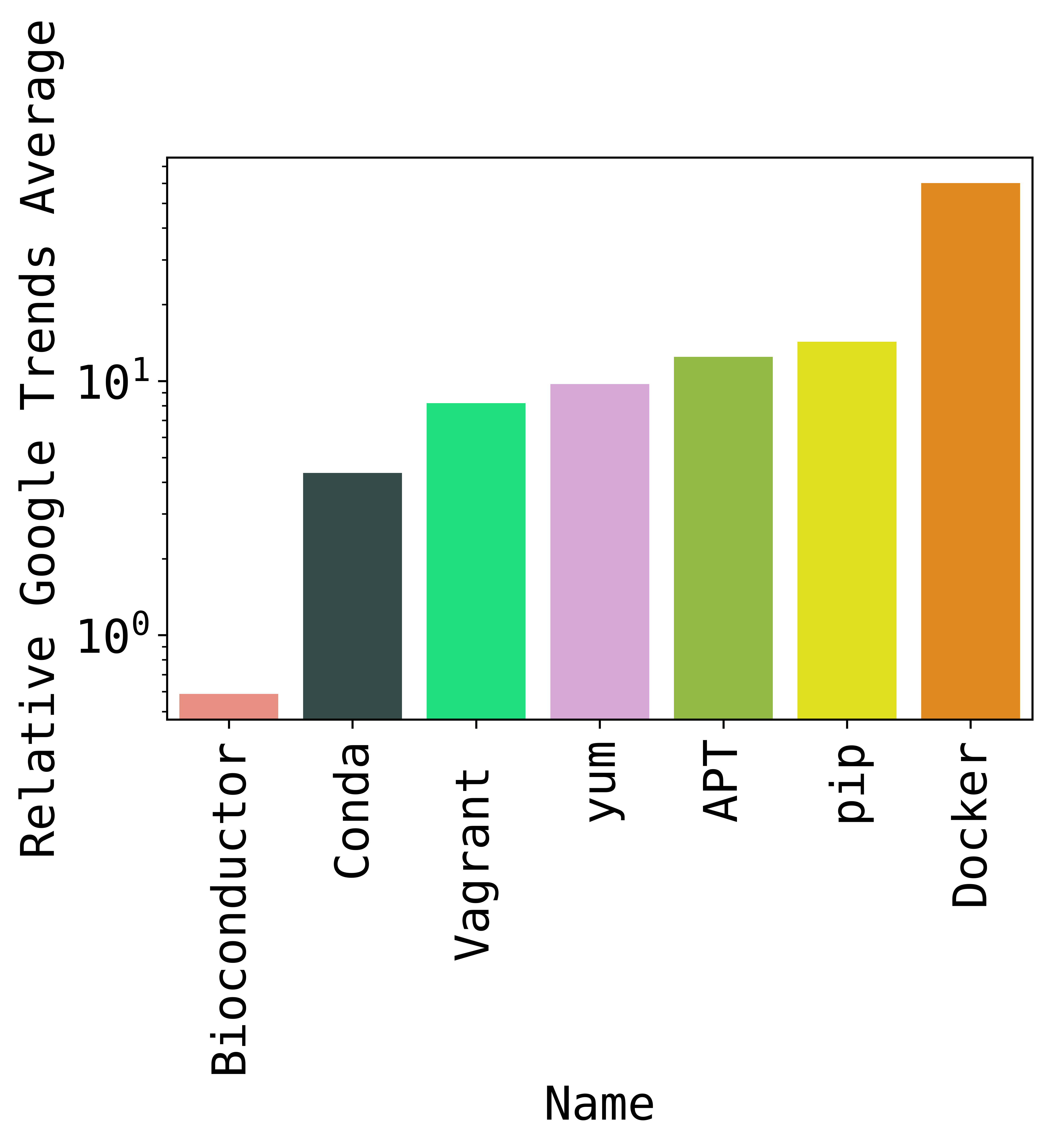 5 Google Trends 10/ was used to assess the relative average popularity of each package manager. Package managers were omitted when Google Trends did not have enough data to return a result. The method detailed in “How do you compare large number of items in Google Trends?” 11/ was used to overcome Google Trends’ limitation of five search terms.